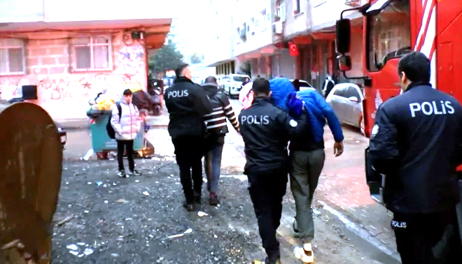 Kimliği öğrenilemeyen 2 kişi polis ekipleri tarafından gözaltına alındı. Yangında ölen ya da yaralanan olmazken dairenin alev alev yandığı anlar cep telefonu kamerasıyla kaydedildi.