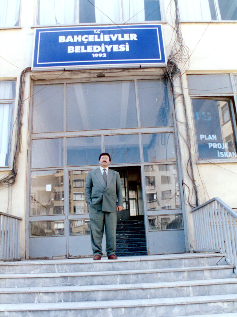 1992’de Bahçelievler ilçe oldu. Kurucu Belediye Başkanı Muzaffer Doğan Başkanlık binaının önünde (Bugünkü kamu binasının yeri)